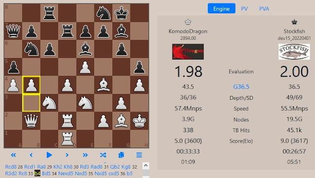 In game 9 there were no exchanges after the start except a pawn pair that was exchanged in the book sequence. KomodoDragon had a space advantage and evals stayed around 1.5. For a while the engines seemed to be shuffling, KomodoDragon waited for the right moment to push a pawn on the queen side.