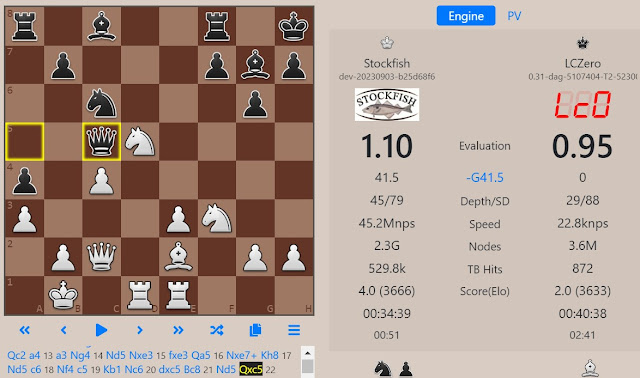 game 145, Leela - Igel: Leela castled long and opened the g file, Igel surrounded its king with pieces. Evals were drawish until move 32, the engines exchanged all rooks and evals started to increase. The game reached a QBN vs QBN position, Leela had a pawn majority on the queen side and the black pieces were far. Leela gave its two minor pieces and queened, after exchanging a pair of queens the game ended in a tablebase win.